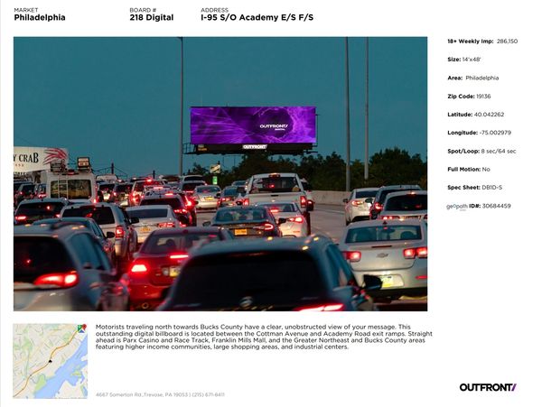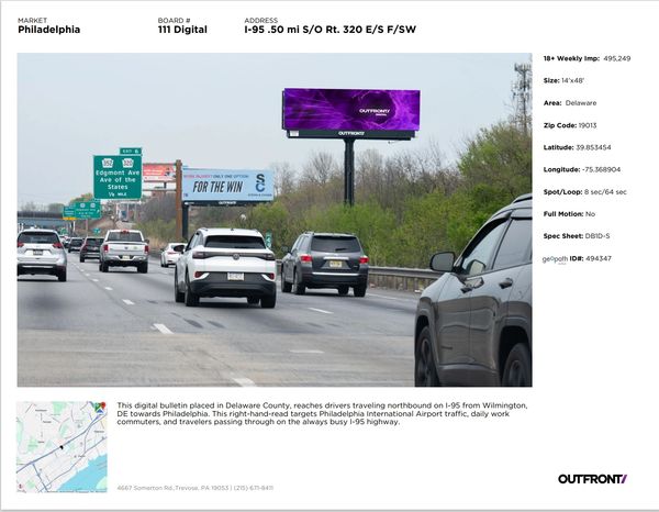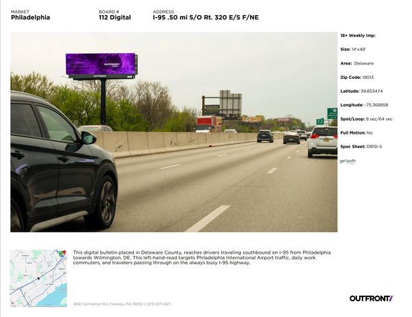 4 weeks of space on One of 3 digital billboards along I-95 in Delaware County or Philadelphia.